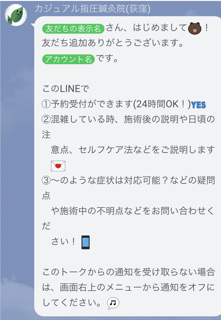 ▶すぐに自動返信の応答メッセージが上記のように届きます。症状や予約の希望日時の候補を2~3つご記入いただきご返信ください。